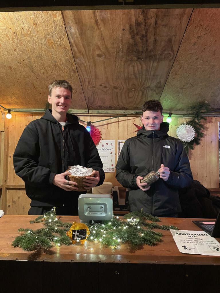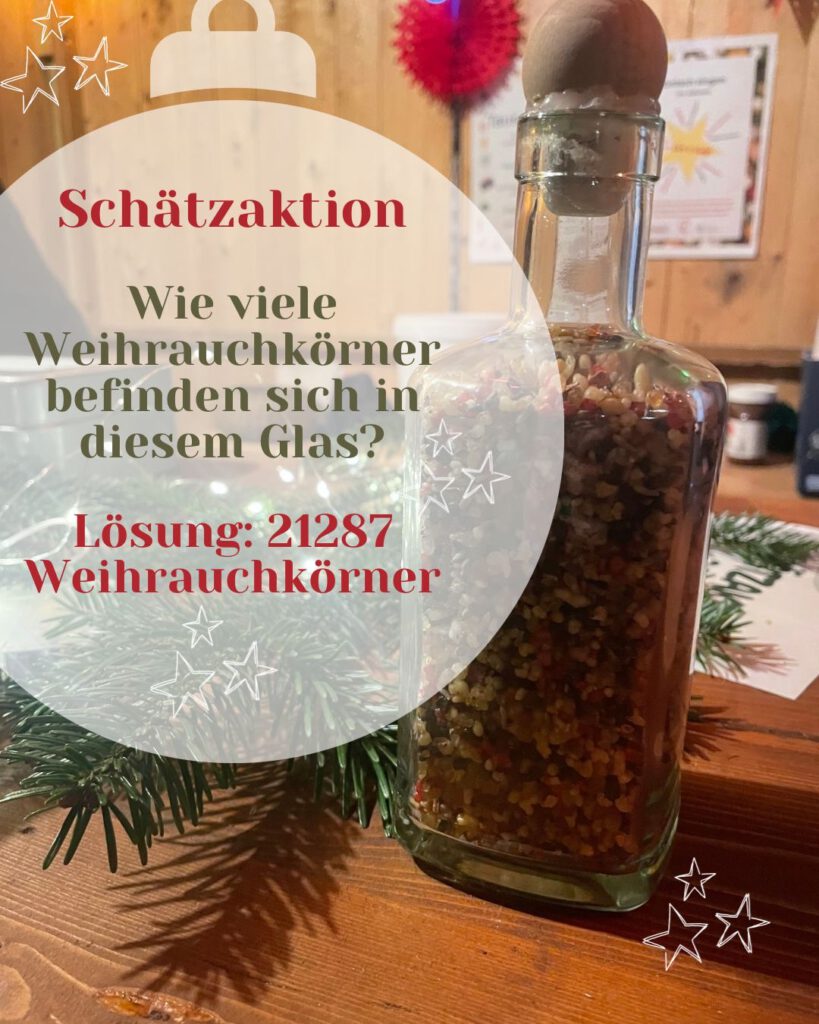 Dieses Jahr haben wir uns von einer auf zwei Buden erweitert in denen wir Crêpes, Kakao und Lose verkauften. Vielleicht habt ihr ja unsere Gruppenkinder gesehen, bei denen ihr auf dem Nussknackermarkt Lose bekommen konntet, die an unserer Bude eingelöst wurden. In der Losbude gab es natürlich wie immer eine Schätzaktion, bei der ihr etwas gewinnen konntet, auch wenn ihr kein direktes Gewinnlos gezogen habt. Bei dieser Schätzaktion ging es darum zu schätzen, wie viele Weihrauchkörner in einem von uns befüllten Glas waren. Die Lösung dafür ist 21.287 Weihrauchkörner. Und, habt ihr richtig geschätzt? Außer der Losbude gab es auch die Essensbude, in der ihr euch mit selbstgemachten Crêpes und mit Kakao mit und ohne Schuss stärken konntet.